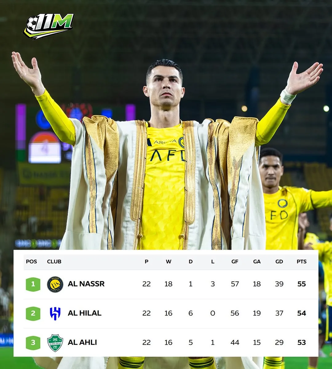Chiến thắng này là thành quả của một chuỗi phong độ thăng hoa với 8 trận thắng liên tiếp – một sự bứt tốc khủng khiếp trong bối cảnh Al Hilal đang có dấu hiệu hụt hơi với những trận hòa đáng tiếc. Hiện tại, Al Nassr đã chính thức chiếm giữ ngôi đầu với 55 điểm, tạo ra áp lực tâm lý cực lớn lên các đối thủ bám đuổi. Từ vị thế kẻ đuổi cùng diệt tận, đội bóng của Ronaldo giờ đây đã trở thành mục tiêu cần bị hạ gục. Cuộc đua vô địch Saudi Pro League 2026 đang trở nên kịch tính hơn bao giờ hết, và với một Ronaldo đang ở trạng thái "hủy diệt", Al Nassr đang tràn đầy tự tin để bảo vệ thành quả này cho đến những vòng đấu cuối cùng.