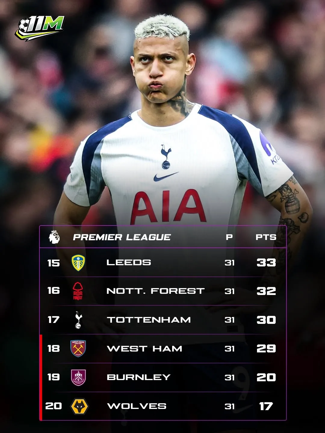 Tottenham vừa đi vào lịch sử khi lên ngôi vô địch Europa League, nhưng vinh quang đó có thể trở thành "vòng hoa tang lễ" nếu họ xuống hạng. Nếu kịch bản tồi tệ này xảy ra, Spurs sẽ là đội bóng đầu tiên trong lịch sử sở hữu 3 danh hiệu lớn ở châu Âu (bao gồm Champions League và Europa League/UEFA Cup) phải xuống chơi ở hạng đấu thấp hơn. Đây là một vết đen không thể gột rửa trong di sản của câu lạc bộ.